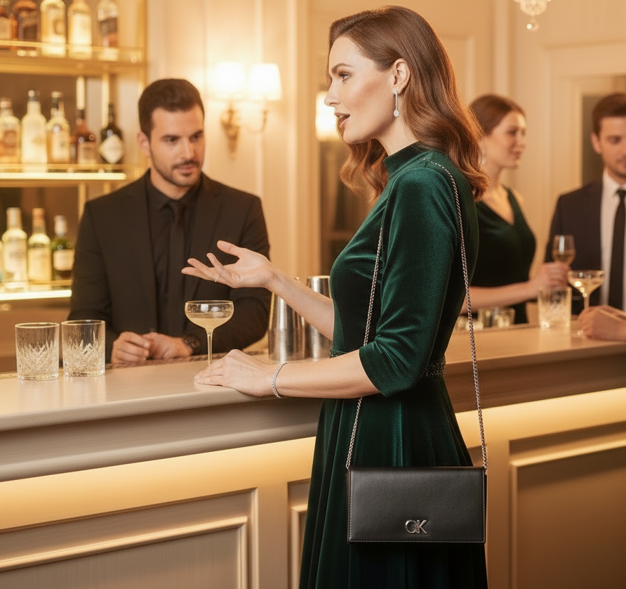 Un accesorio compacto y elegante, confeccionado en piel negra de acabado suave. Presenta un diseño minimalista con detalles discretos y el logo de la marca, ideal para llevar lo esencial. Su estilo moderno y refinado lo convierte en el complemento perfecto para eventos o salidas nocturnas.